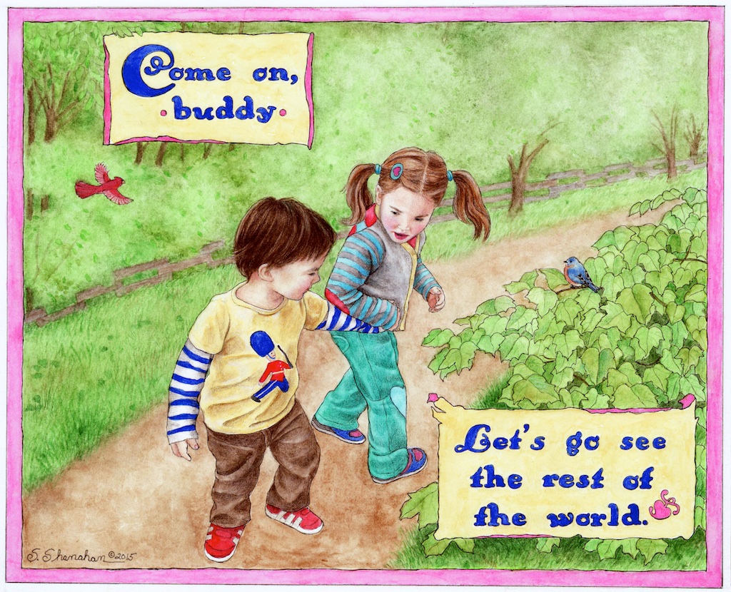 When I heard that Siena, the little girl in the above art, took her brother, Rhett, by the hand and said, “Come on buddy. Let’s go see the rest of the world” I thought, I want to be like her. Spontaneous. Free. I immediately set plans to illustrate the scene. As I worked on my watercolor, it dawned on me (as so often happens) that my need to paint the image was my way of working out more of my life lessons. As I put the finishing touches on the piece, I realized that I had successfully replaced some of the corrupted applications downloaded in my youth. And what would be the names of the new programs? Trust Yourself, Approach Life with Wonder, and It’s Safe to Explore. And so it is.